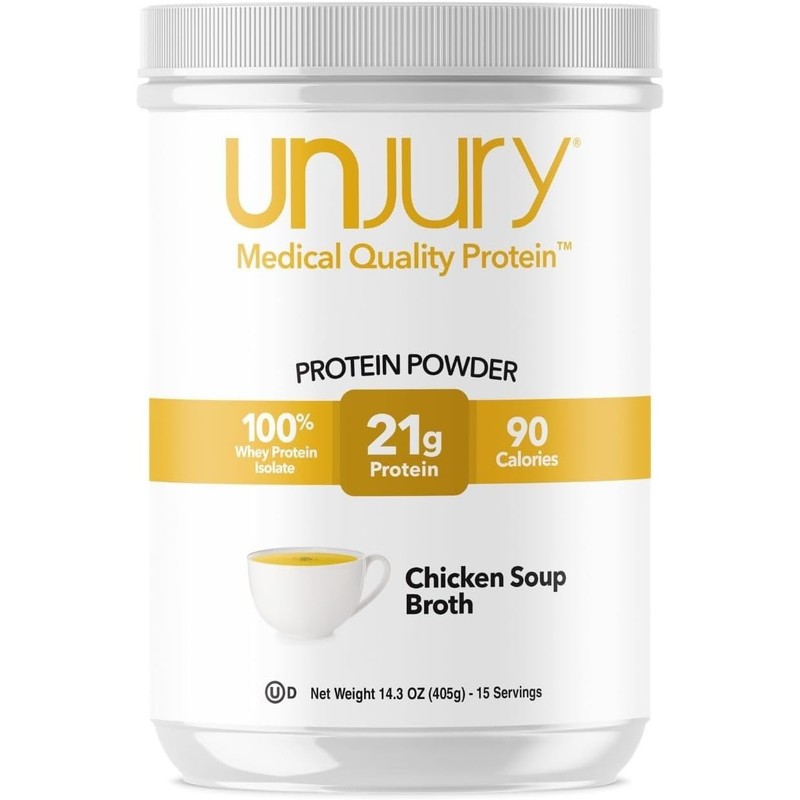 Discover the delicious taste of UNJURY Chicken Soup high-protein drink mix. Made with 100% whey protein isolate, this is the highest-quality protein you can buy. Quality Tastes Better!