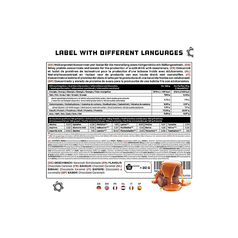 Whey Protein Pulver - 1000 g (Schokolade Karamell) - Mit Isolate Anteil - Instant lösliches Eiweiss Protein Pulver mit BCAA & EAA - German Elite Nutrition