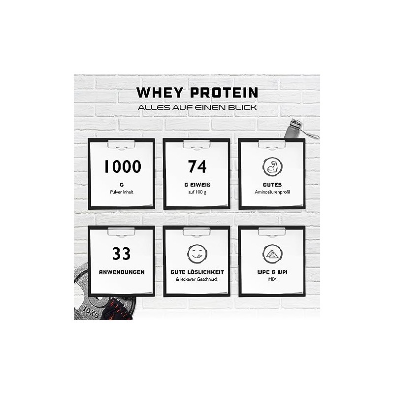 - PREISLEISTUNG: 1kg hochwertiges Whey Protein im optimalen Isolat - Konzentrat Mix. Freue dich auf einen besonders leckeren Geschmack & einer cremigen Konsistenz. Besonders hoher Proteingehalt mit ca. 22g Eiweiß pro Portion. 33 Servings, inklusive Dosierlöffel.