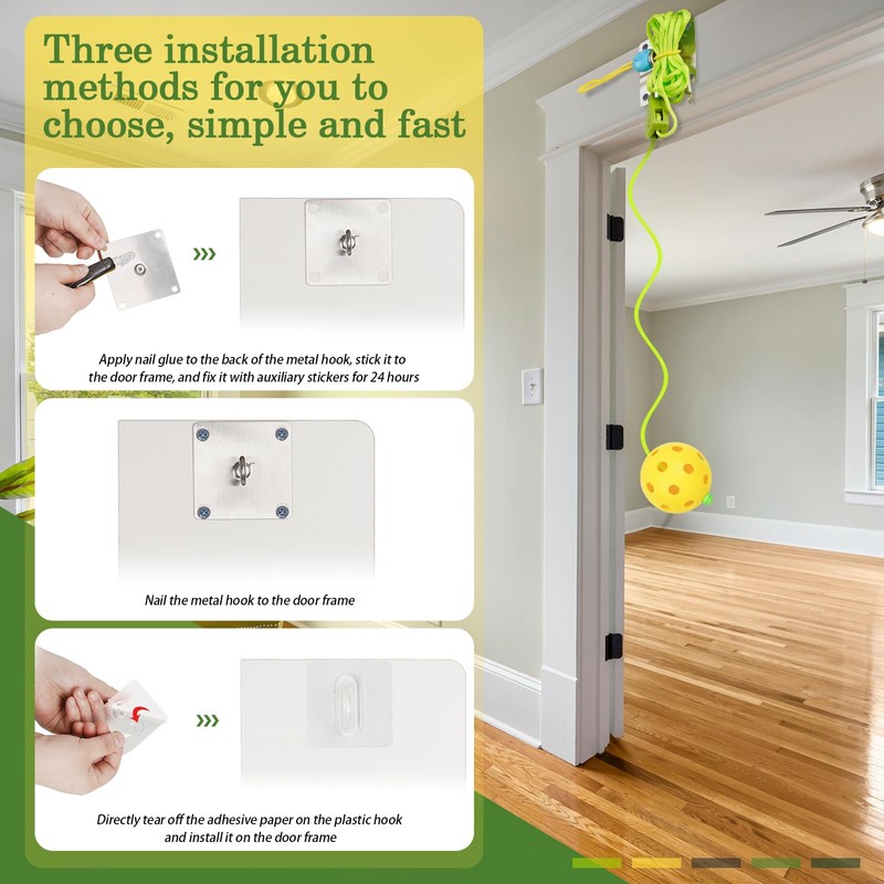 - Easy installation: Contains three plastic hooks, 1 metal hook, and a set of pickleball training kits. There are three installation methods to choose from. You can directly stick the plastic hook on the door frame, or apply adhesive on the back of the metal hook, or install it by punching holes. The installation is very simple.