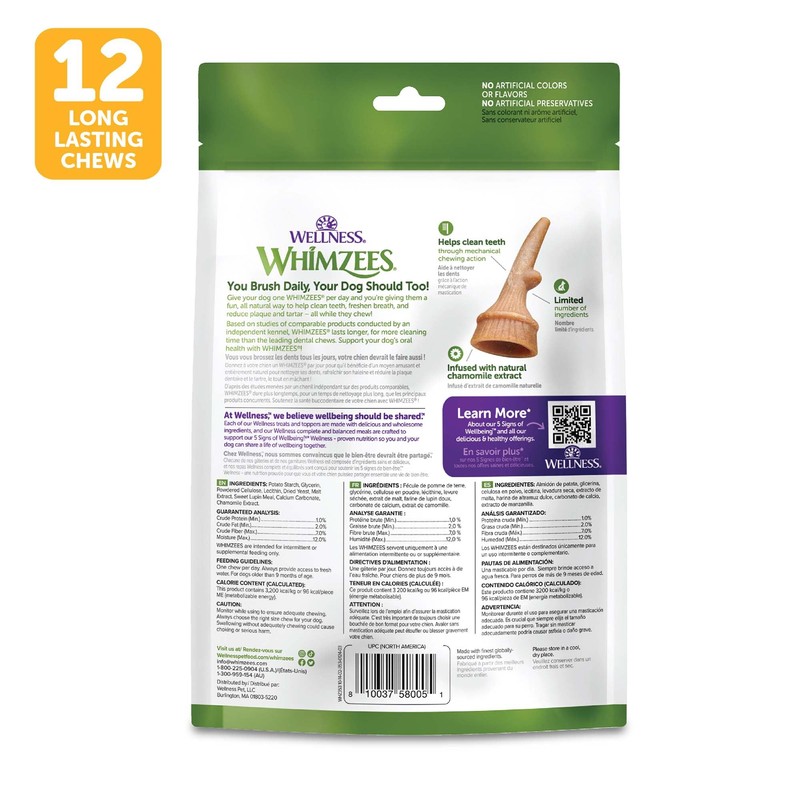 You brush daily, your dog should too! Give your dog one WHIMZEES? per day and you're giving them a fun, all natural way to help clean teeth, freshen breath, and reduce plaque and tartar C all while they chew! Dental disease is the number one health issue for dogs, affecting 80% of adult dogs. That's why we believe it's more important than ever to take an active role in your pup's at-home dental care. What separates WHIMZEES? from the pack? Designed by our team of pet health experts, WHIMZEES? are scientifically proven to help control plaque and tartar and freshens breath. Based on studies of comparable products conducted by an independent kennel, WHIMZEES? lasts longer, for more cleaning time than the leading dental chews. Support your dog's oral health with WHIMZEES?!