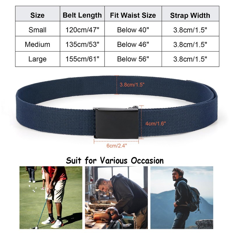 - ❤Fully Adjustable - no holes required, canvas web belt fit everyone, all shapes and sizes! 3 sizes to be chosen. The buckle is removable, allowing you to resize it. Resizing: Cut it down to the size needed and then melted the cut end, put the cut end back under the smaller latch and locked it.