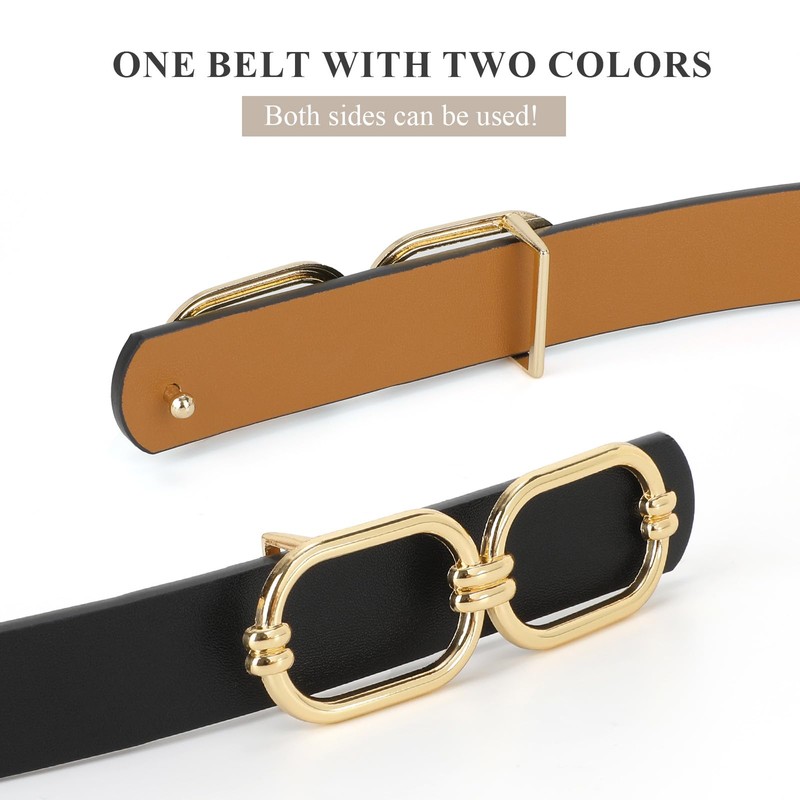 - 【Fashion Gold Buckle Leather Belt】 - Detachable gold alloy buckle, durable and not easy to fade, remove the buckle to another side you can get a different color of women skinny belt. Simple and fashionable design makes you more charming. Reversible leather belt will flatter your figure perfectly.