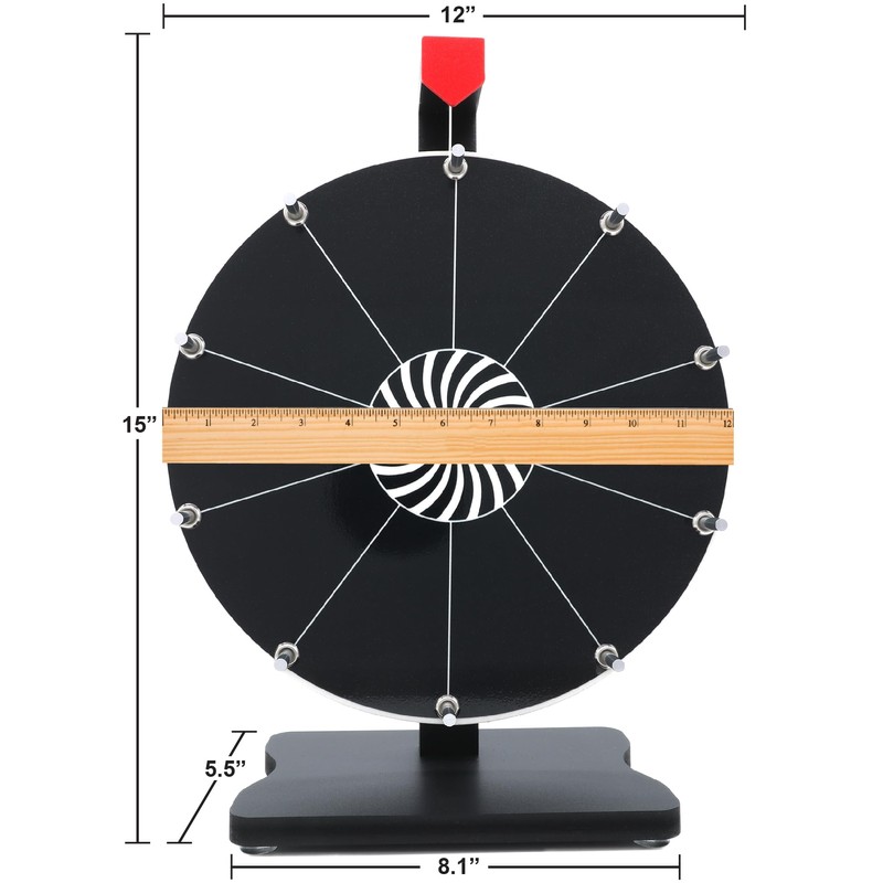 - 😄 Miniature prize wheel stands 15" tall and 12" wide. Easy to carry spin the wheel game with stand can be placed on any table and when done, takes very little storage space. The small spinner wheel fits nicely on counters and tabletops. Manufactured in America.
