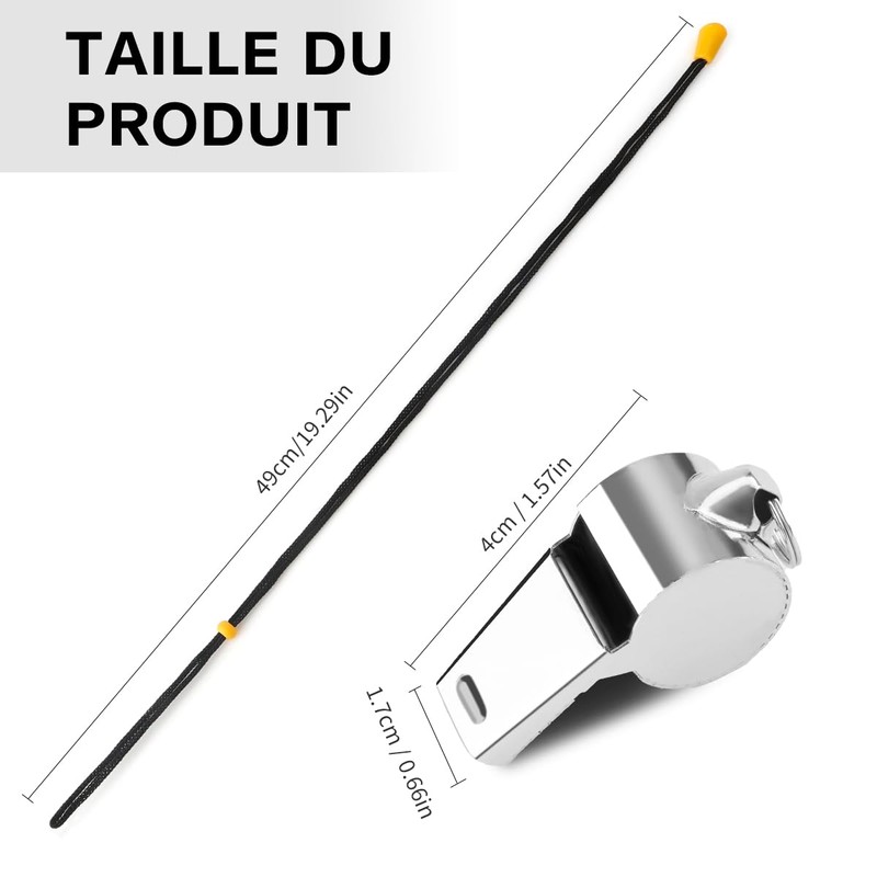 Whistle length: stainless steel whistle length is 4 cm/1.57 inch, width is 1.7 cm/0.66 inch, the length is 49 cm/19.29 inch after the cord is straightened. Plastic whistle length is 4.3 cm/1.69 inch, width is 1.7 cm/0.66 inch, the length is 47 cm/18.5 inch after the cord is straightened. Suitable for most of the People the size, with lanyard, lightweight and easy to carry.