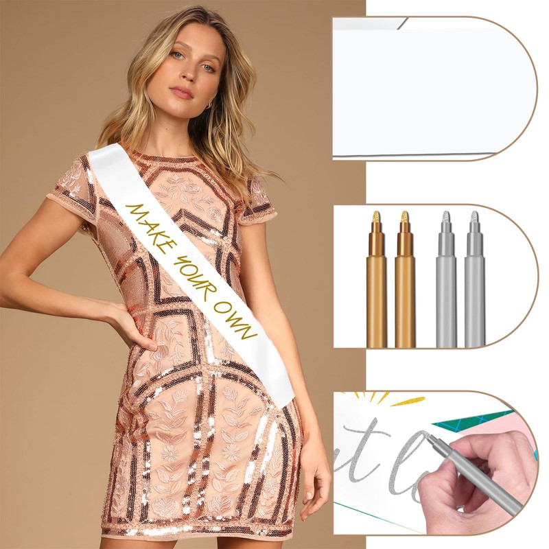 • 🎉Complete Kit: Includes a set of 4 vibrant fabric pens 2 gold, 2 silver and 5 sashes, allowing you to add names, messages, or artistic touches.