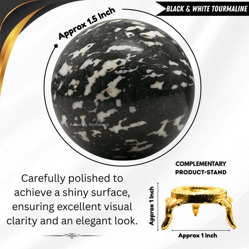 White and Black Tourmaline Crystal Ball with Stand - 1.5" Inches Crystal Sphere Meditation Balls for Witchcraft and Decorative Balls