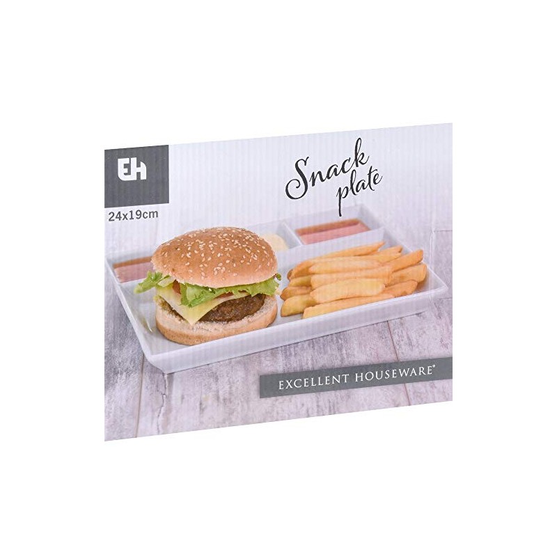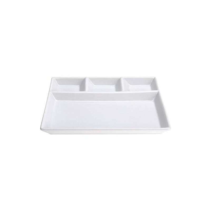 • A plate with four compartments that can easily accommodate and serve multiple food. Made of high quality porcelain, this plate features a large section for main dishes and three smaller sections, making it perfect for organizing various foods such as burgers, wraps, pasta, chips, vegetables, sauces and dips.