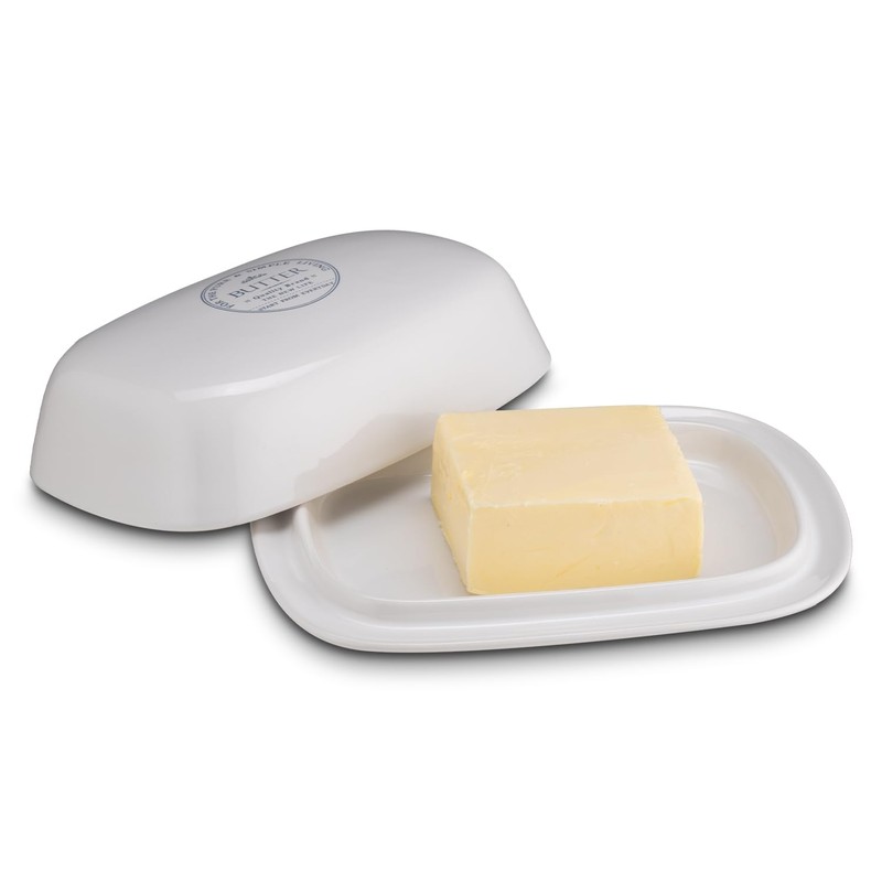 - The KHG butter dish is created with a simple white with a decorative inscription in grey. The stoneware is covered with a glossy finish and can be ideally combined with elegant furnishings.
