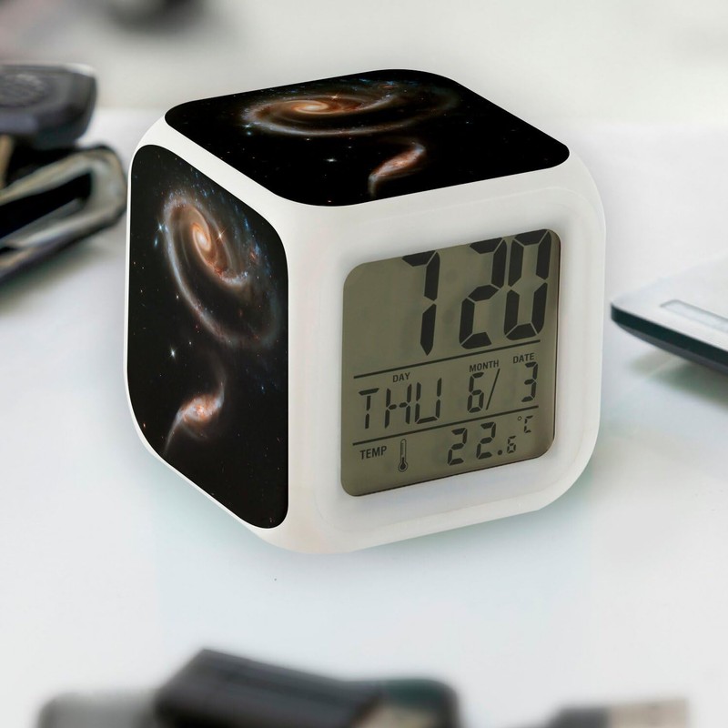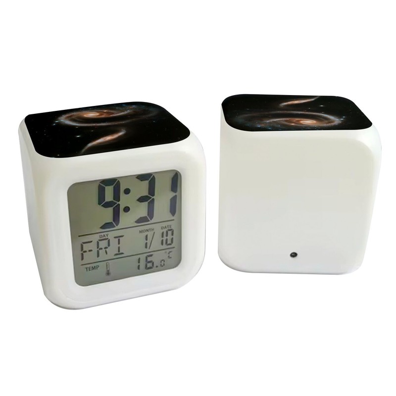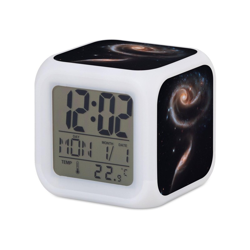 White Cube Illuminated Alarm Clock - Nebula Universe, Galaxy, Stars, Space - 7.8 x 7.8 x 7.8 cm - Retro Lighting Multicolour LED