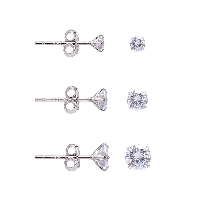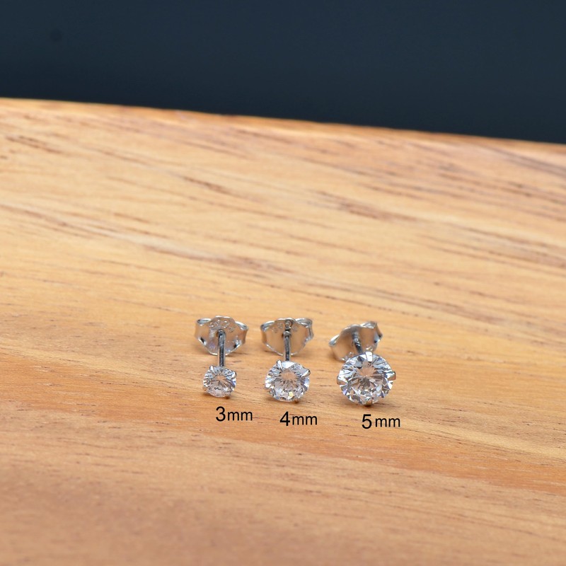 - Crystal Clear Studs Earrings Set: This is a set of white cubic zirconia studs earrings, 3/4/5 mm round diamond cut stones for each, total 3 pairs of sterling silver earrings