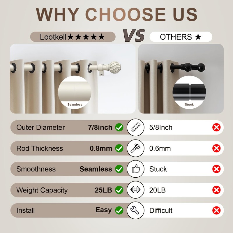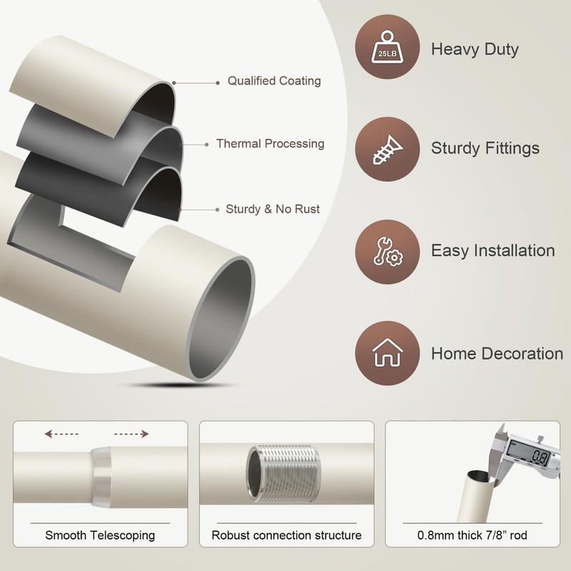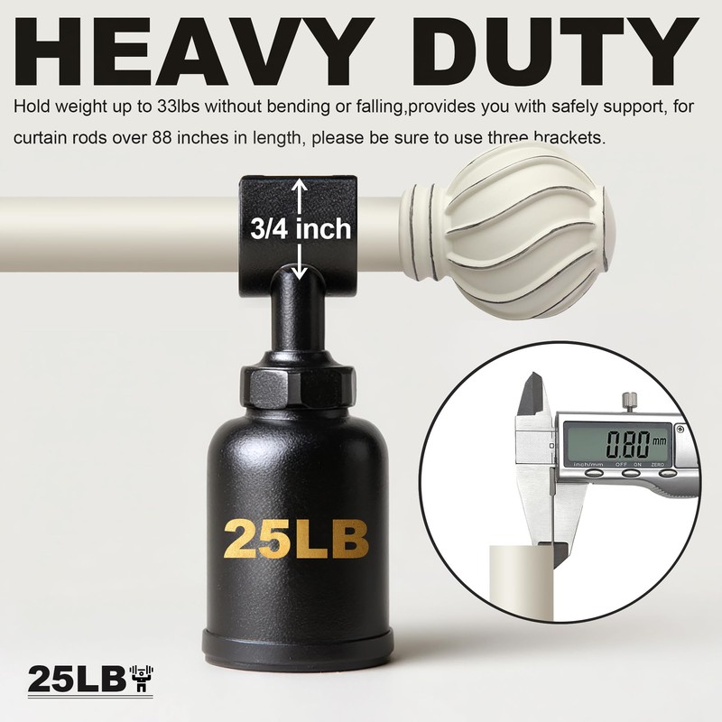 - 【Heavy Duty Curtain Rods】This curtain rods for window are constructed from 0.8mm thick 7/8" Diameter metal rod enable the curtain rod to provide better support and stability, greatly reducing the risk of bending and sagging. With iron brackets and sturdy screws, each rod is finished with a proven baking process for a smooth surface. It is strong enough to carry up to 25 pounds and can support curtains of various materials and weights, giving you more freedom to choose the style of your curtains.
