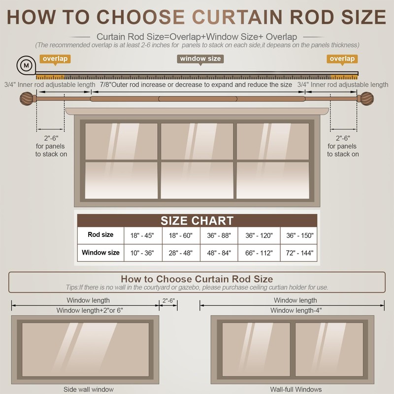 - 【How to Choose a Right Curtain Rod】Please measure your window size(Don't only measure the glass but the entire window frame.) before purchasing to help you choose a right curtain Rod.Curtain Rod Size = Overlap + Window Size + Overlap(The recommended overlap is at least 2-6 inches for panels to stack on each side,it depeans on the panels thickness),so a right curtain rod should be 4-12 inches longer than your window size.If your window is 36 inches, your curtain rod should be 18-60 inches.