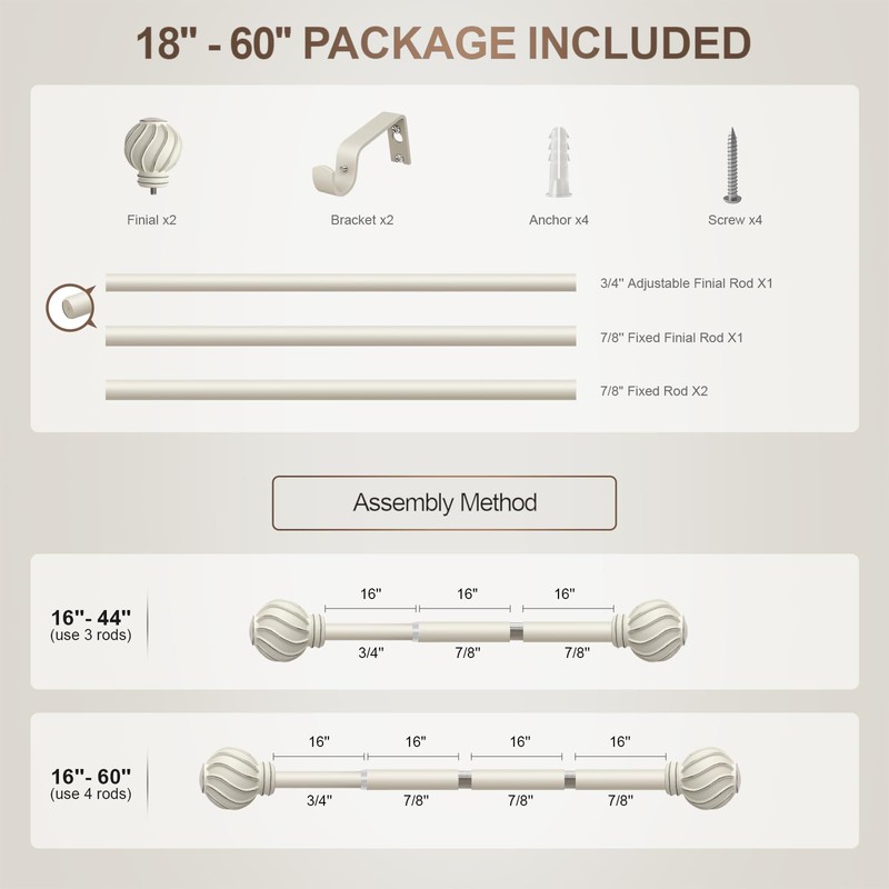 - 【Adjustable Curtain Rods with Brackets】This brown curtain rods featuring an upgraded telescoping sectional construction,you can freely adjust the size you want by decreasing the number of fixed rods or adjust the inner rod.This curtain rod is adjustable from 18 to 60 inches.18 to 60 is the size of the curtain rod, not the window size. When choosing a curtain rod size,add 4-12 inches to your window size for the best curtain rod size for your window.