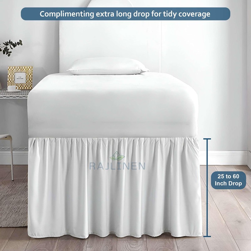 - 🛌 Dorm Bed Skirt With Split Corners : Thanks to the split corners of this practical bed skirt, you can show off your foot board for an effortlessly easy upgrade to your bedroom or Dorm room decor. A great way to add style to your college dorm room is with your unique extra long Twin bedding. You can adjust the extended length to fit shorter dorm bed heights by simply attaching the ties higher up, thus reducing the amount of fabric overhang