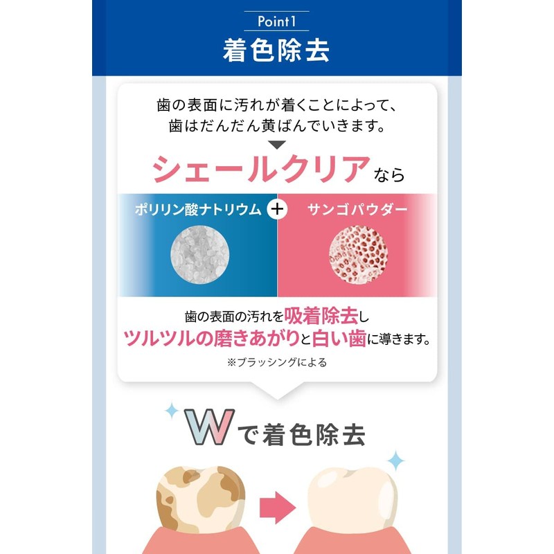 - Shale Clear: This toothpaste is a luxurious blend of coral powder with highly effective stain removal and sodium polyphosphate. By removing yellowing and staining, it leads to smooth white teeth. * By brushing