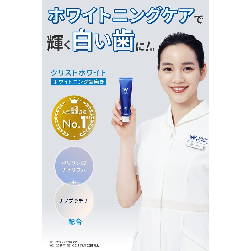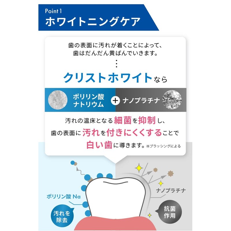 - Christo White: This toothpaste is a luxurious blend of nano-platinum and sodium polyphosphate with excellent antibacterial properties. By suppressing bacteria that become a hot bed of dirt, it leads to a glossy and shiny teeth. * By brushing