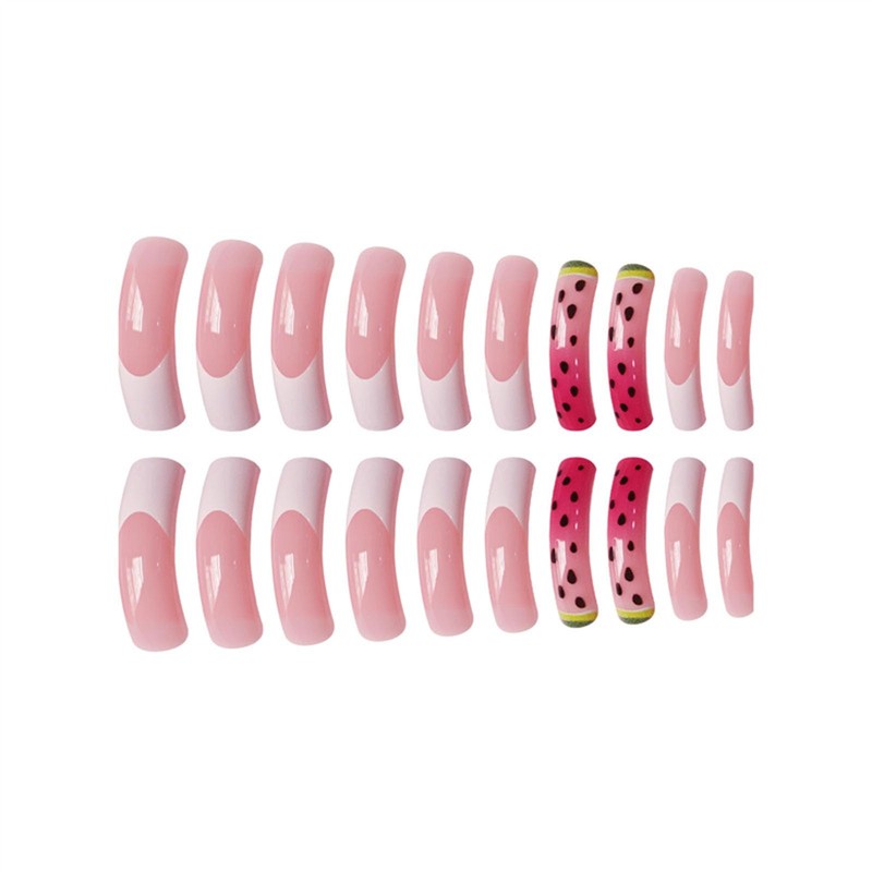- 【Fashion Design】: Extra long curved press on nails square featuring a playful white French watermelon pattern on a pink glossy acrylic base. The curved, elongated silhouette adds an elegant, avant-garde touch, making them perfect for holidays, parties, or daily wear. These artificial, reusable nails are designed to elevate any outfit with a bold, sophisticated fingertip statement