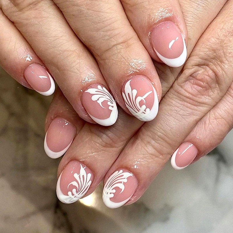 White French Tip Press on Nails Short Round Fake Nails with White Leaves Design Glue on Nails Press ons Pink Translucent False Nails Glossy Artificial Stick on Nails for Women 24Pcs
