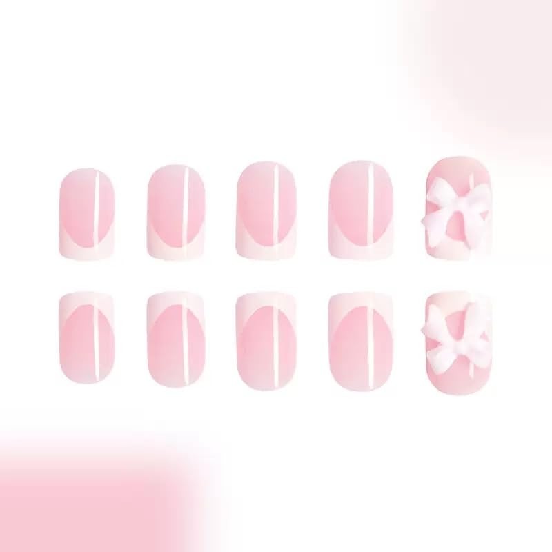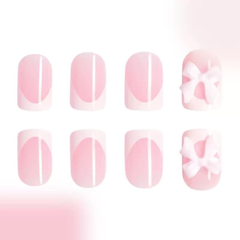 White French Tip Press on Nails Short Square Fake Nails Cute False Nails with Design 3D Pink Bow Glue on Nails Glossy Full Cover Stick on Nails Reusable Artificial Nails for Women 24Pcs