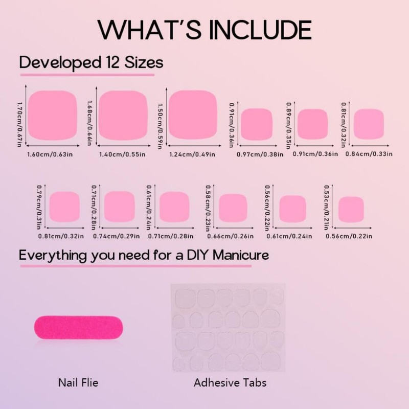 - Multiple Application:Glue on toenails with design are great for learners at all stages,suitable for nail salons and diy nail art at home. Stick on toenails for women are great for special occasions, such as shopping, on the summer beaching, swimming or playing with your pets