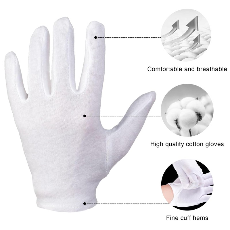 These white cotton gloves come with good elasticity, beautiful shape and comfortable fabric. Suitable for jewellery, silver and coin inspections, machine washing and reuse.