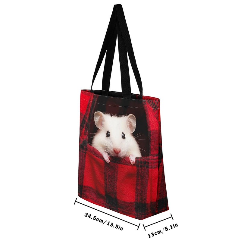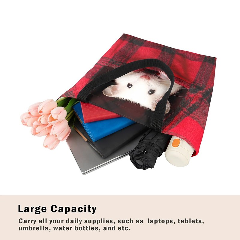 White Hamster Canvas Tote Bag,Red Lattice Foldable Beach Bag Cute Animals Lovely Pet Casual Reusable Handbag for Women