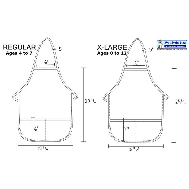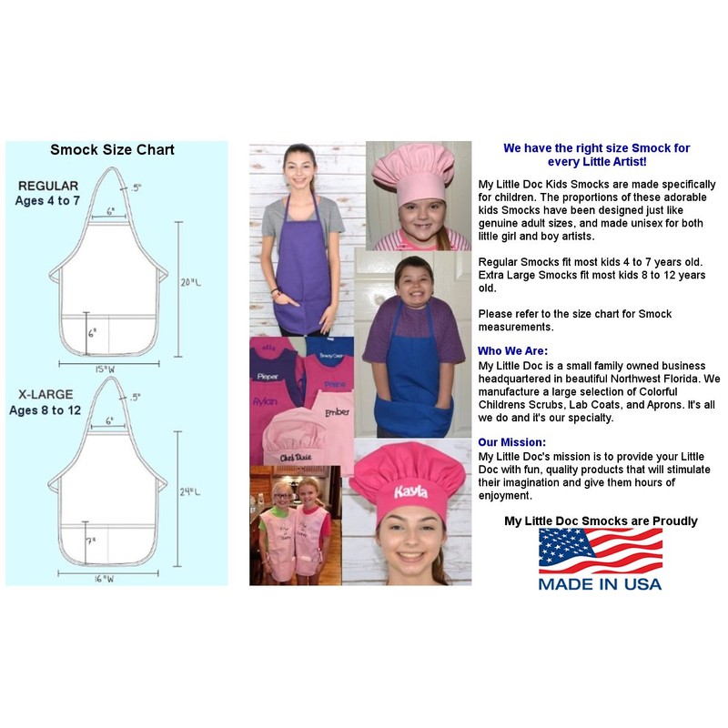 My Little Doc Brand Kids Art Smocks are Authentic Smocks just like a real Artist wears. These Smocks are made from a high quality heavy 7.5 ounce Poly/Cotton Twill fabric containing 65% Polyester/35% Cotton and are fully Machine Washable. These Smocks include a Soil Release and Crease Resistant Finish with Reinforced Stress Points. They have classic Art Smock styling with two front pockets and an adjustable tie in the back. Extra Large fits Kids 8 to 12 years.