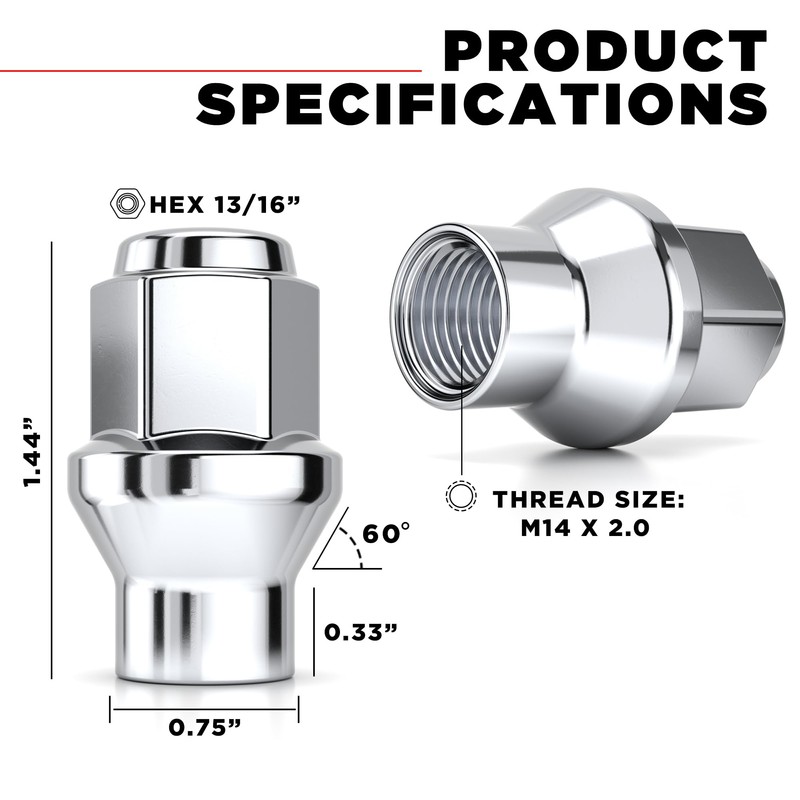 • Specifications: M14 x 2.0 Thread Pitch, 1.44" Overall Height, 0.75" Base Diameter, 0.33" Shank Length, 13/16" Hex, 60-Degree Conical ET Seat