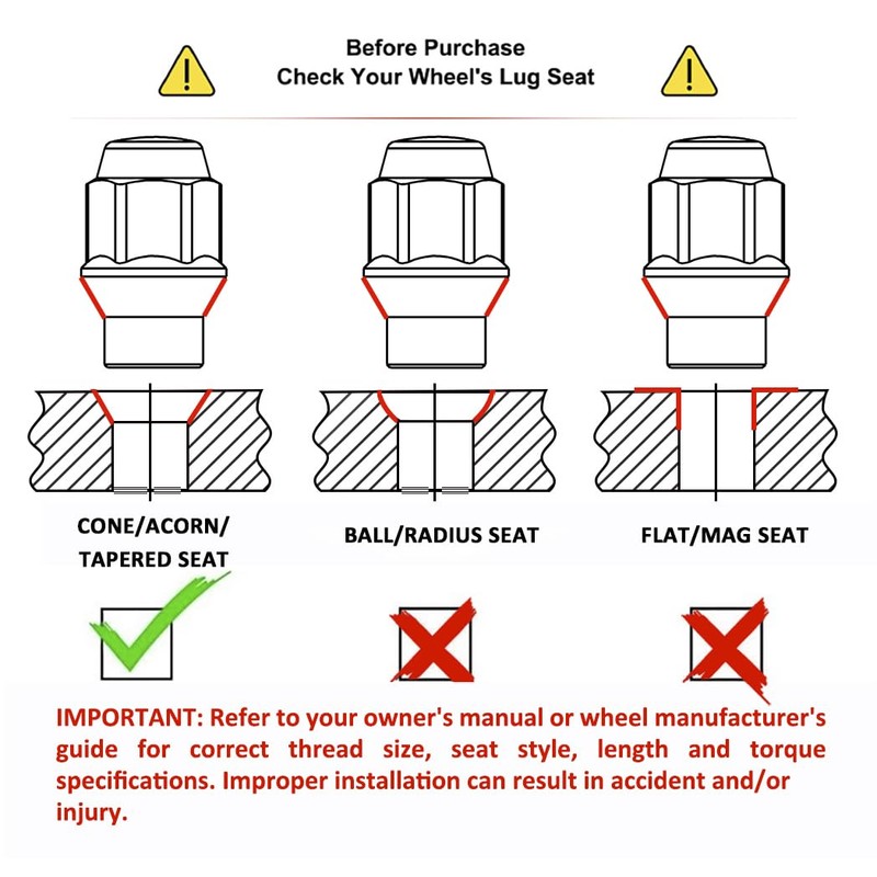 • ATTENTION: Refer to the owner’s manual or the wheel manufacturer’s guide for the correct thread size, seat style, length, hex and torque specifications. You assume all liability of improper installation which can result in accident and/or injury.