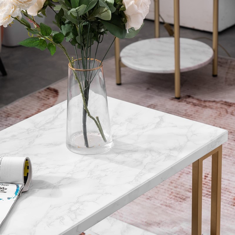 White Marble Print Coffee Table with Gold Metal Legs, 2 Tier Center Table for Living Room, Modern Simple Rectangular Table, Accent Furniture for Living Room and Bedroom