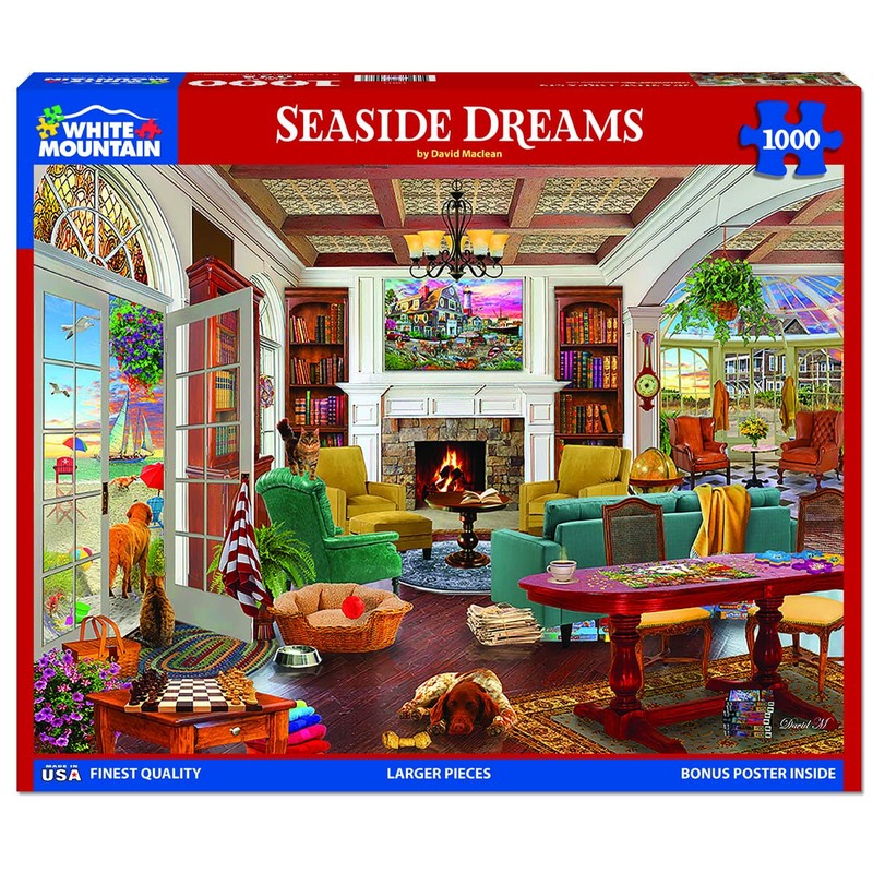 - BEAUTIFUL ART - White Mountain presents high rated puzzles created with photography & artwork. This cool 1000 piece puzzle has a detailed image of a beach house complete with pets, sand, a fireplace, & the ocean.