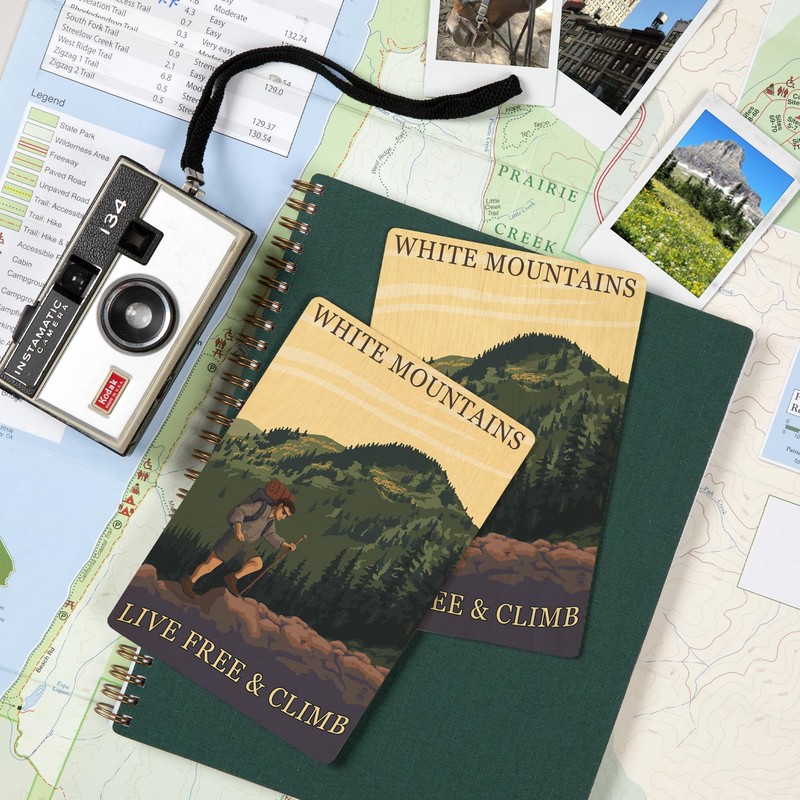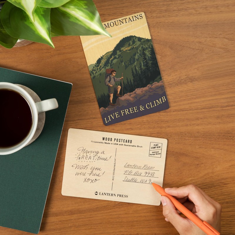- White Mountains, New Hampshire, Live Free and Climb Hiker Scene (4x6 Birch Wood Postcards, 2-Pack Stationary, Rustic Home Wall Decor), high-quality sustainable wood printed in Seattle