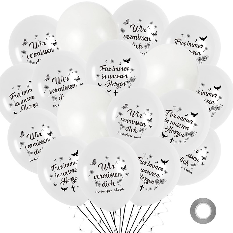 Includes 36 pieces - 15 balloons with "Wir vermissen dich"/"In ewiger Liebe", 15 balloons with "Forever in our hearts" and 6 plain white balloons.