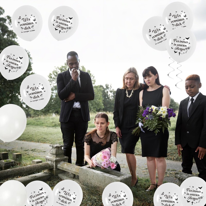 - Extensive mourning balloon set: our set includes 15 balloons with the words "Wir vermissen dich" and "In ewiger Liebe", 15 balloons with "Forever in our hearts" and 6 plain white latex balloons - ideal for a dignified design of funerals, funerals and memorial events