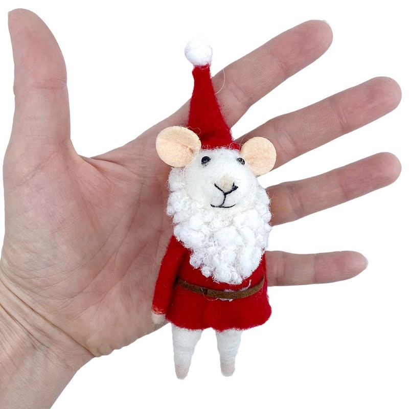 White Mouse Ornament in Santa Costume - Wool Decoration for Christmas Tree