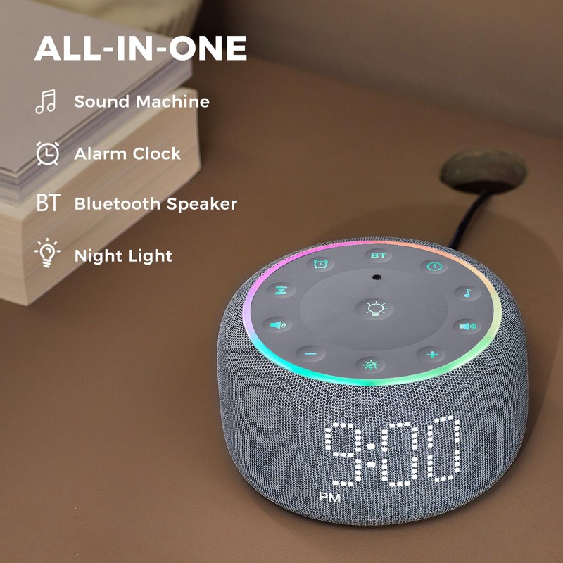 - 4-in-1 Versatile Sleep Aid: Featured with sound machine, alarm clock, high-quality Bluetooth speaker, night light, automatic/manual dimming screen display and sleep timer, this multifunctional noise machine helps you fall asleep faster and casts a private relaxing moment anywhere.