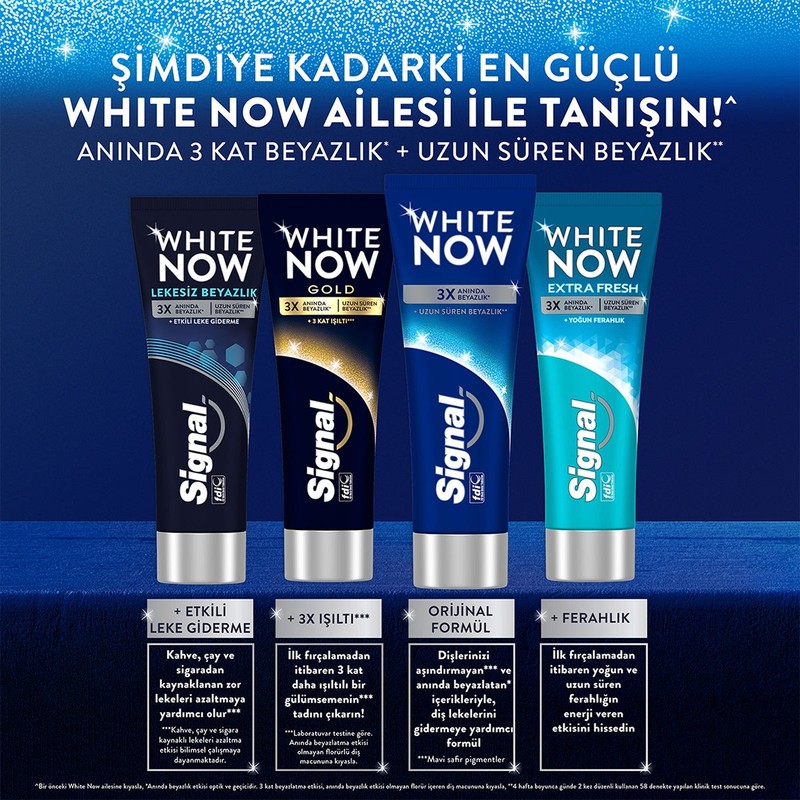 SİGNAL WHITE NOW DİŞ MACUNU 75 ML Devrim yaratan özel blue light teknolojisi ile dişleriniz tek fırçalamada anında daha beyaz görünür. Diş lekelerini gidererek beyazlık sağlayan formülü sayesinde düzenli kullanımda daha da beyaz dişlere sahip olmanızı sağlar."Mesafeli Satış Sözleşmemiz uyarınca; toptan veya yeniden satış amaçlı oluşturulduğu tespit edilen siparişler ile ürün, hizmet ve indirimlerimizden tüm müşterilerimizin faydalanabilmesi ve stokçuluğun engellenmesi için 6 adetin üzerindeki doğrudan ve dolaylı siparişleri Eve’in iptal hakkı saklıdır."