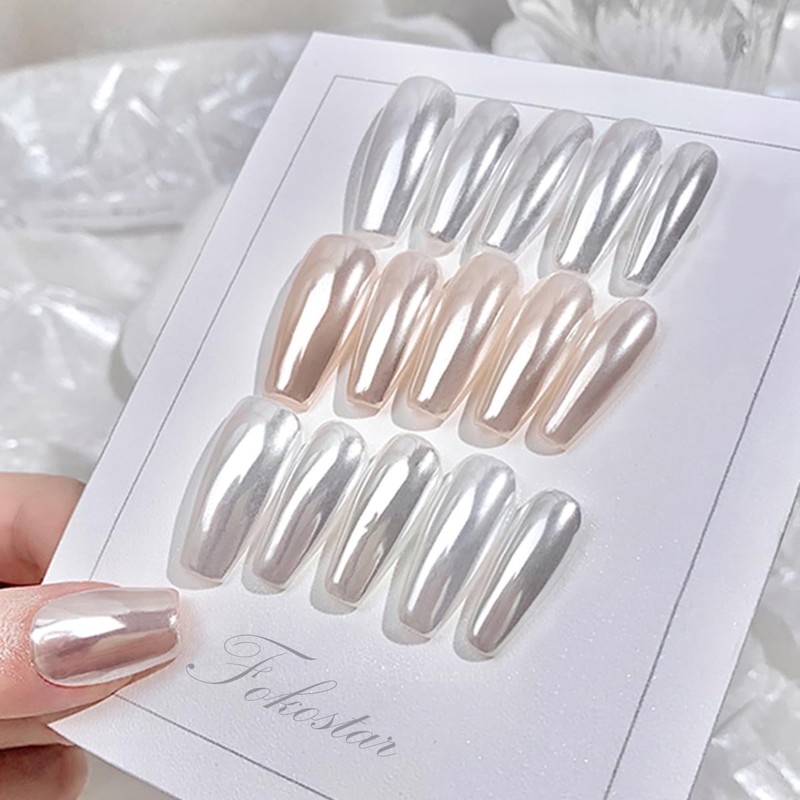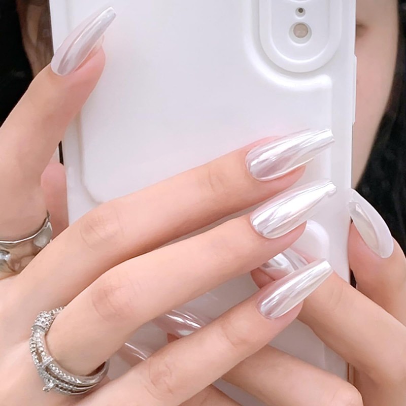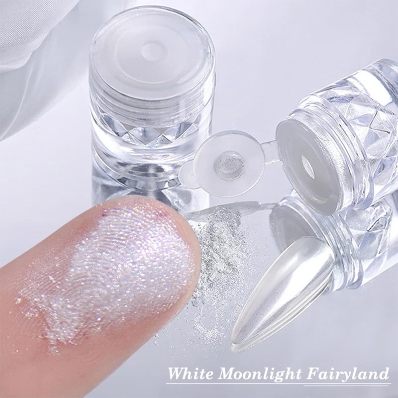 - 【White Pearl Nail Powder】1 White Shimmer Silver Mirror Chrome Nail Powder (0.5g/jar) + 1 Sponge Applicator. Glossy pearl powder will make your nails as silver white and bright as the sky. It's brighter, whiter and more advanced than regular silver chrome powder, as if adding a mirror to your nails.