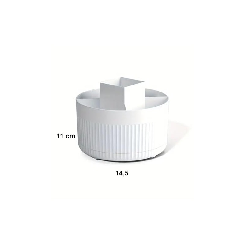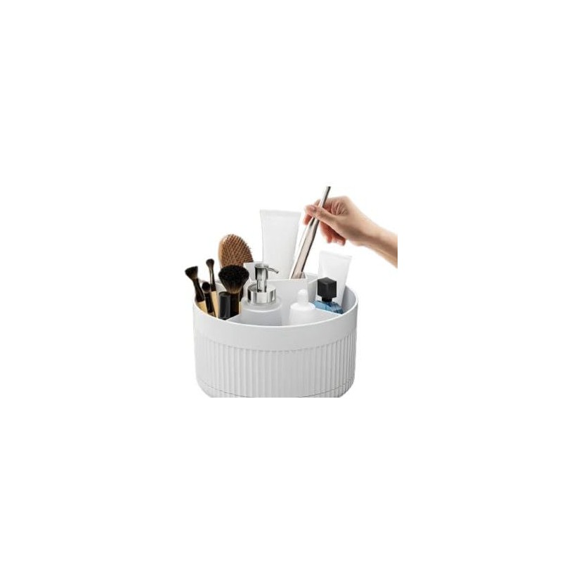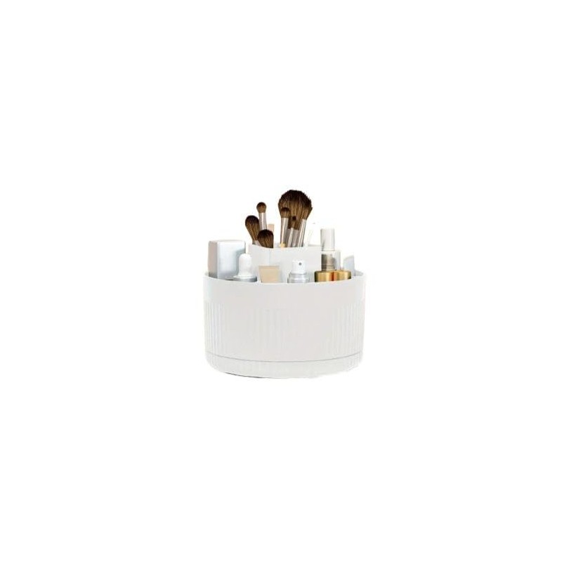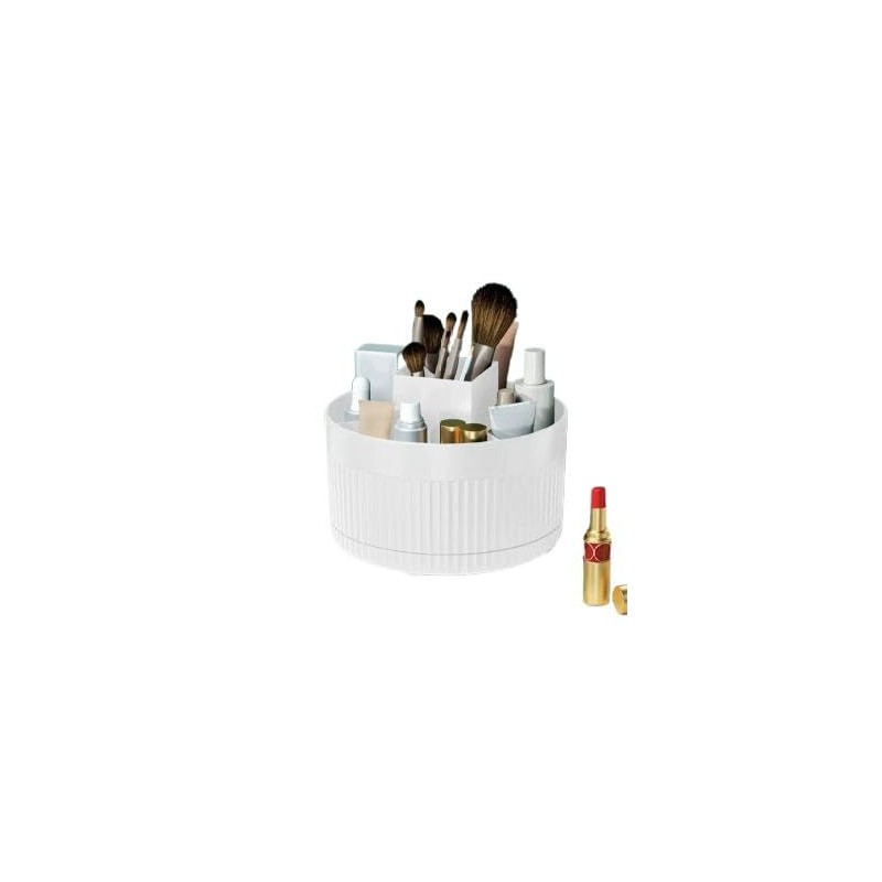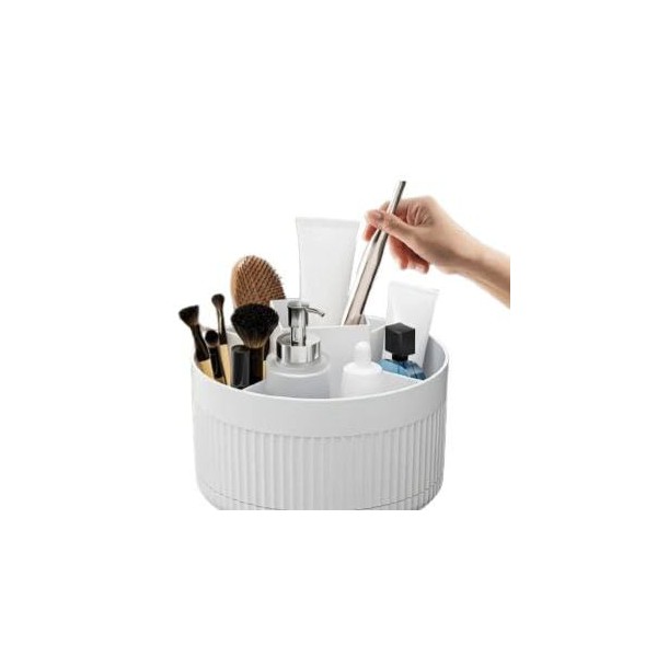 This stylish cosmetic organizer is the perfect solution to keep all your makeup products tidy. With its modern, minimalist design in pure white, it fits perfectly with any bathroom or dressing table decor. The circular structure features decorative grooves that add a touch of sophistication, while the well-designed interior compartments provide space for brushes, lipsticks, mascara and other makeup accessories. Made from high quality materials. This rotating makeup organizer allows easy access to all your essential cosmetics. The compact but spacious design optimizes the space on the surface of your bathroom furniture or vanity and keeps all your beauty products organized and within easy reach. The sturdy base prevents accidental tipping over and protects your valuable cosmetics.