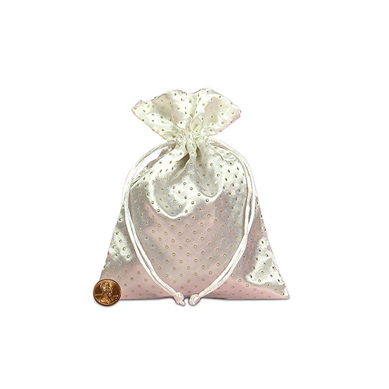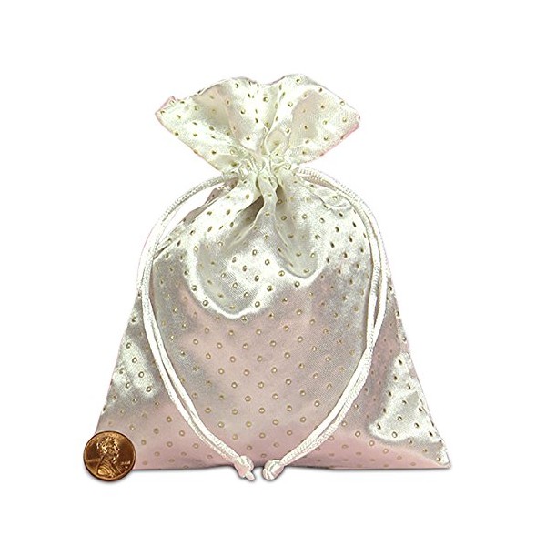 White Satin Pearl Bags 5" X 7" | Quantity: 12 - White Satin Pearl Bags 5" X 7" are satin bags with an upscale appearance. Satin bags come with studded with small gold dots that glimmer in the light. Bags close shut with a cord pull string in the same color as the bag. Beautiful satin bag.