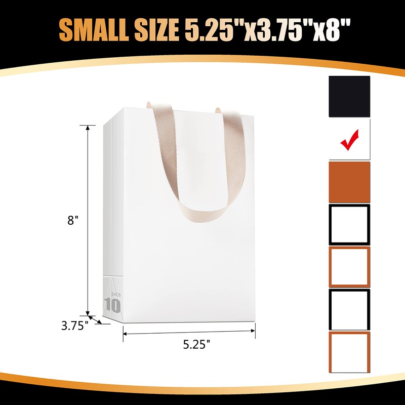 - 〖Quantity and Dimensions〗Including 10Pcs 5.25"L x3.75"W x8"H thick white gift bags.The bags are small size for smaller items such as jewelry, aromatherapy products, make up, etc. Kindly to remind that pls reading bag's size as picture 3rd show. Make sure it match with your requirements.