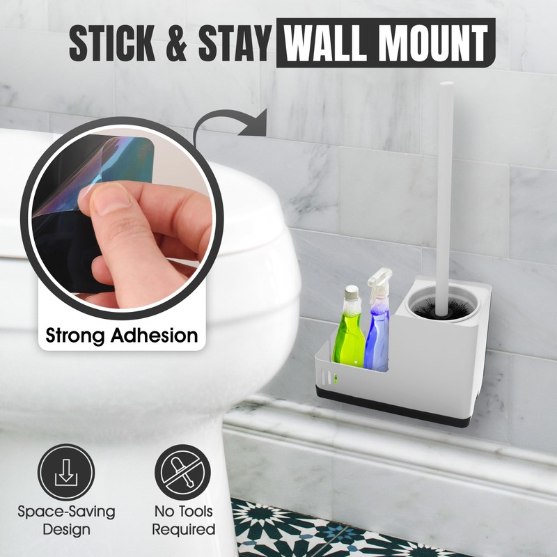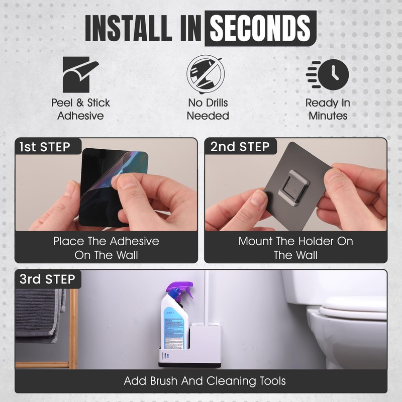 - EFFORTLESS INSTALLATION IN MINUTES - Set up your wall toilet brush holder quickly and easily—no tools required. Simply stick the included adhesive tape to the wall, hang the holder, and instantly elevate your bathroom’s functionality and style.