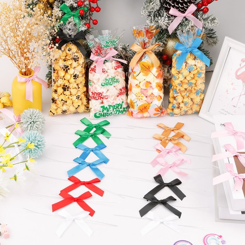 - 【Multiple Use】 These mini bows for crafts can fix various plastic bags like treat bags, gift bags, candies bags, chocolate packaging, cookie bags, bakery bags, goodie bags, party favor bags, etc. The twist tie bows are also ideal for christmas trees decorations, presents making, cake pop, gift box, gift basket, bottles, invitations card, hair clips, sewing, scrapbooks, and other DIY homemade projects. You can use imagination to make interesting and beautiful objects with your family and friends.