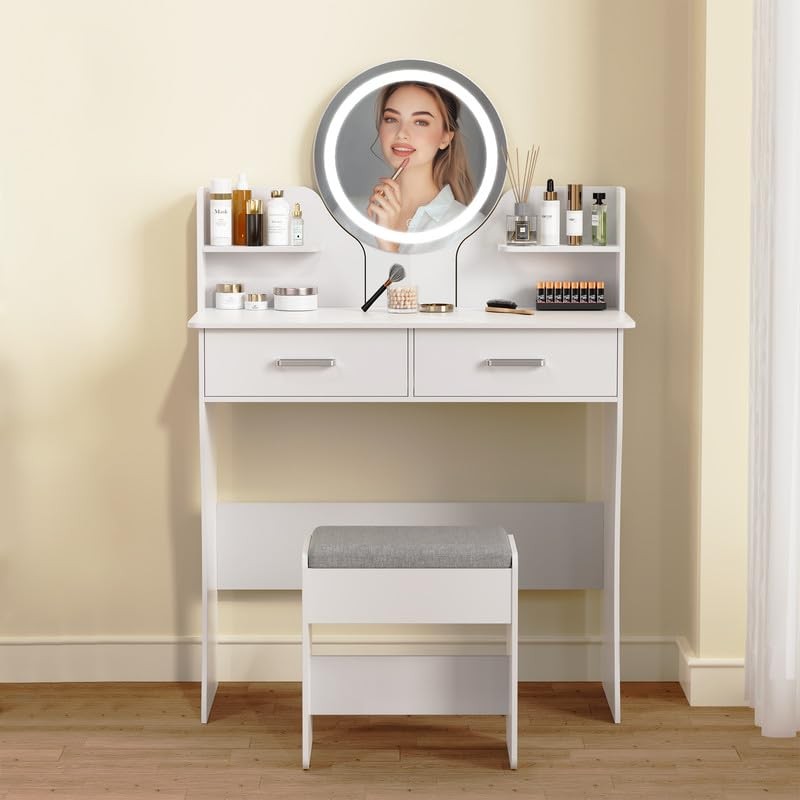 - Round LED Mirror with Adjustable Lighting: This vanity desk features a modern, round mirror with integrated LED lights offering three adjustable color modes—warm, natural, and cool. The vanity with mirror and lights ensures perfect illumination for makeup application, skincare routines, and hairstyling, allowing you to customize the lighting to your preference and the time of day.