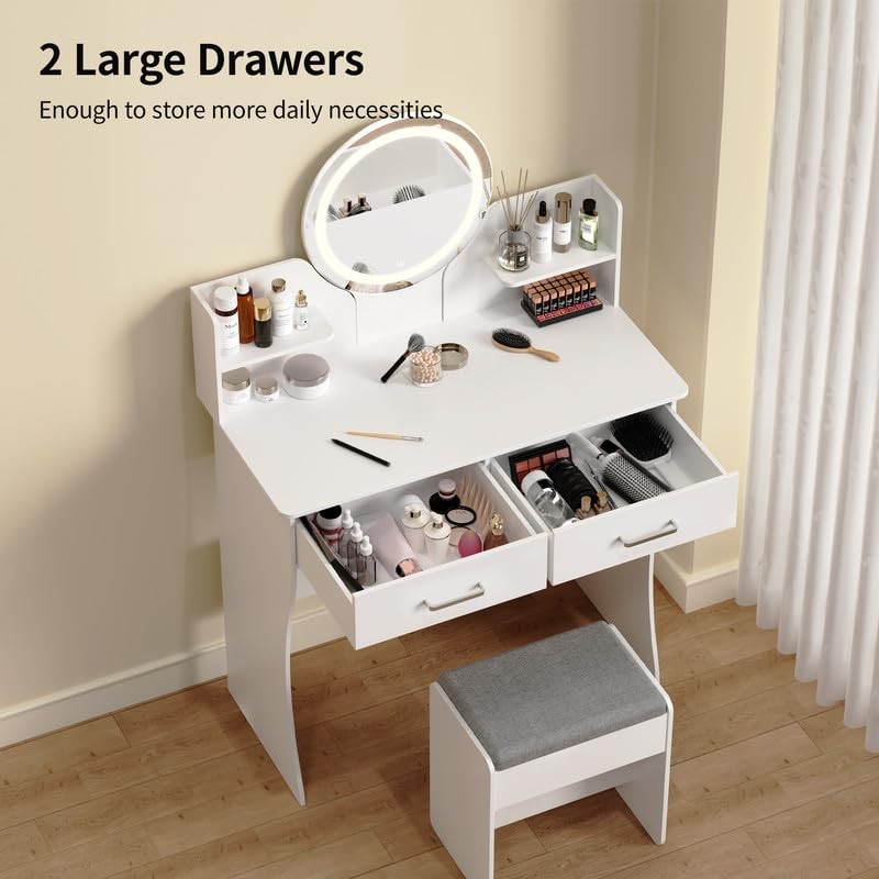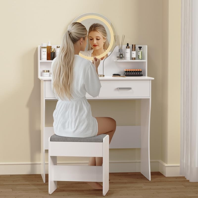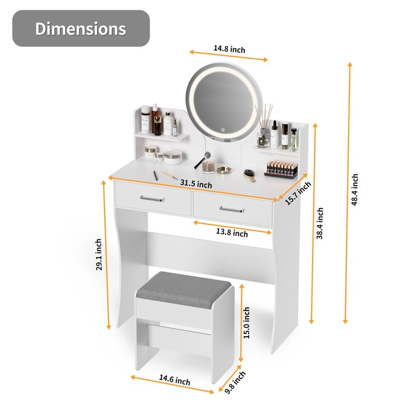 - Space-Saving Design: Designed as a small vanity desk, this set is ideal for rooms with limited space. The compact structure combines functionality with style, making it a versatile addition to any bedroom or dressing area. Its sleek and minimalist design fits effortlessly into various decor styles, making it a perfect white vanity choice.