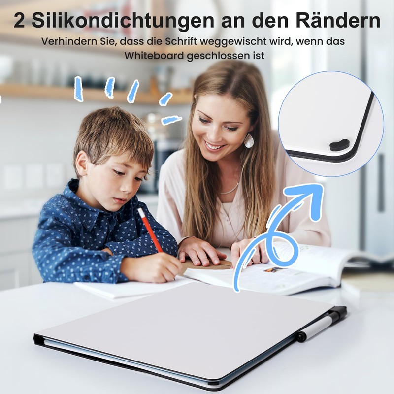 • Portable and erase-proof: With a lightweight size of 12.4 inches x 9.5 inches and a weight of 0.4 kg, it can be easily stored in your office bag, backpack, school bag or luggage, which is very suitable for travel or outdoor use. In the middle of the hinge, an environmentally friendly silicone seal is attached to the top and bottom corners to ensure that the written contents are not erased by the closure.