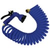 15' Blue Coiled Hose with Adjustable Nozzle Features: 15' Blue Coiled Hose with Nozzle Male fitting: 3/4" Female Fitting: 3/4" Material: Polyrethane Hose