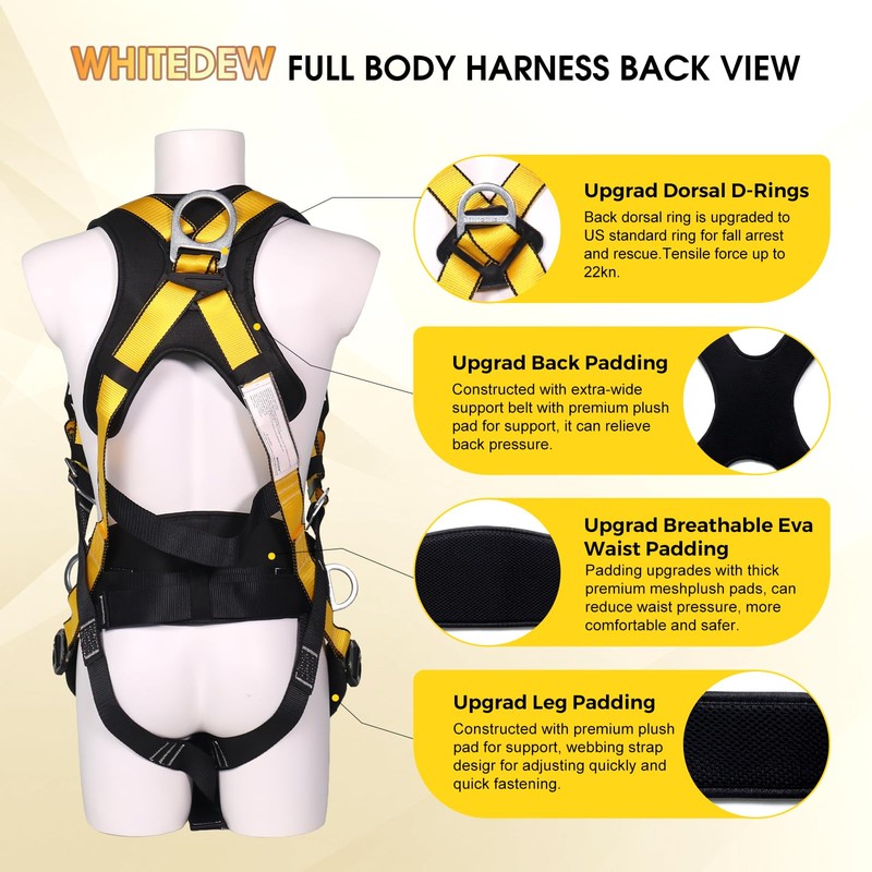 - MANY USES: Suitable for a variety of applications such as construction, demolition, climbing, hunting, roofing, emergency, first responder, landscaping, safety and more, the WHITEDEW safety harness is versatile and essential to ensure your safety while working at heights tool