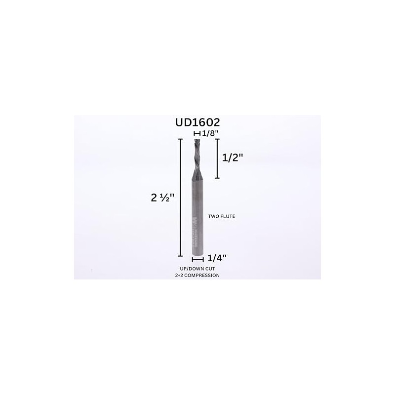 - TOOL SPECS: Solid carbide, 2+2 compression spiral with 1/8" cutting diameter, 1/4" shank, 1/2" cutting length, and 2-1/2" overall length for use in routers with a 1/4" collet.
